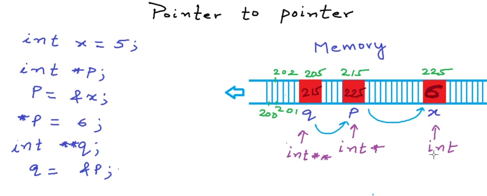 #include <stdio.h> int main(int argc, char *argv[]) { int a = 8; int *p; p = &a; // &a is address of a printf("%d\n", p); // p is 2002 printf("%d\n", p + 1); // p+1 is 2006 return 0; }a pointer to pointer(pic source = youtube mycodeschool)