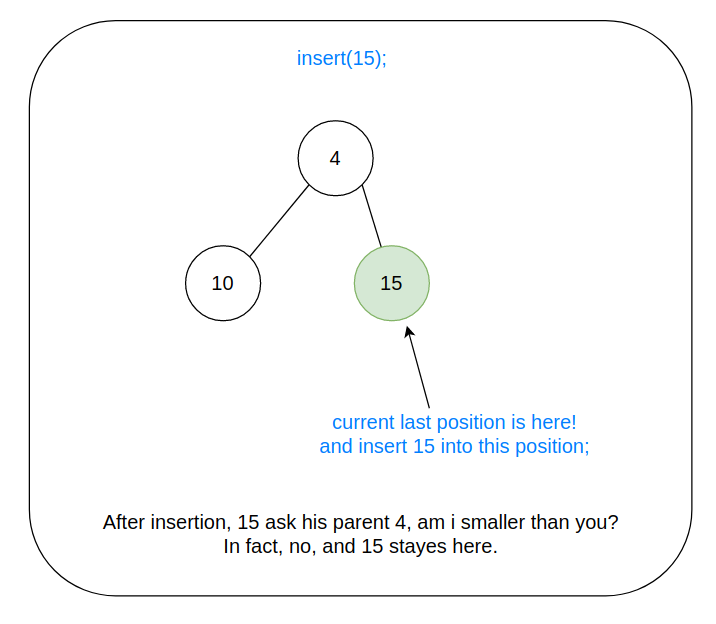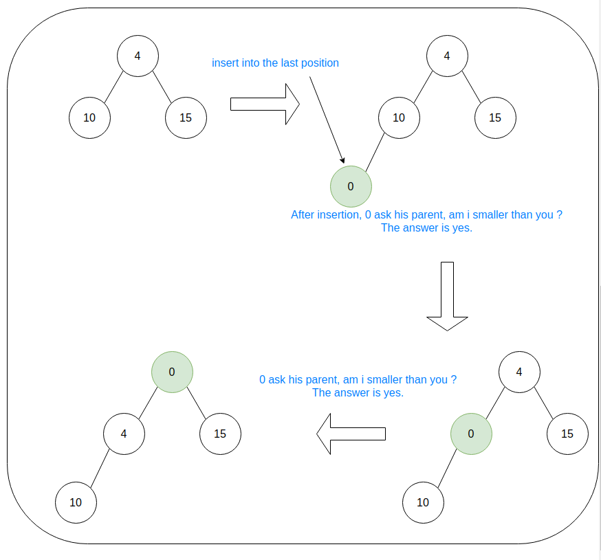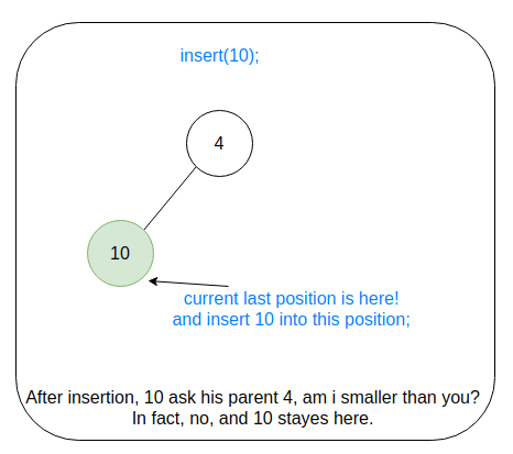 - heap 在每次插入后,都要调整,插入后和父亲比较。