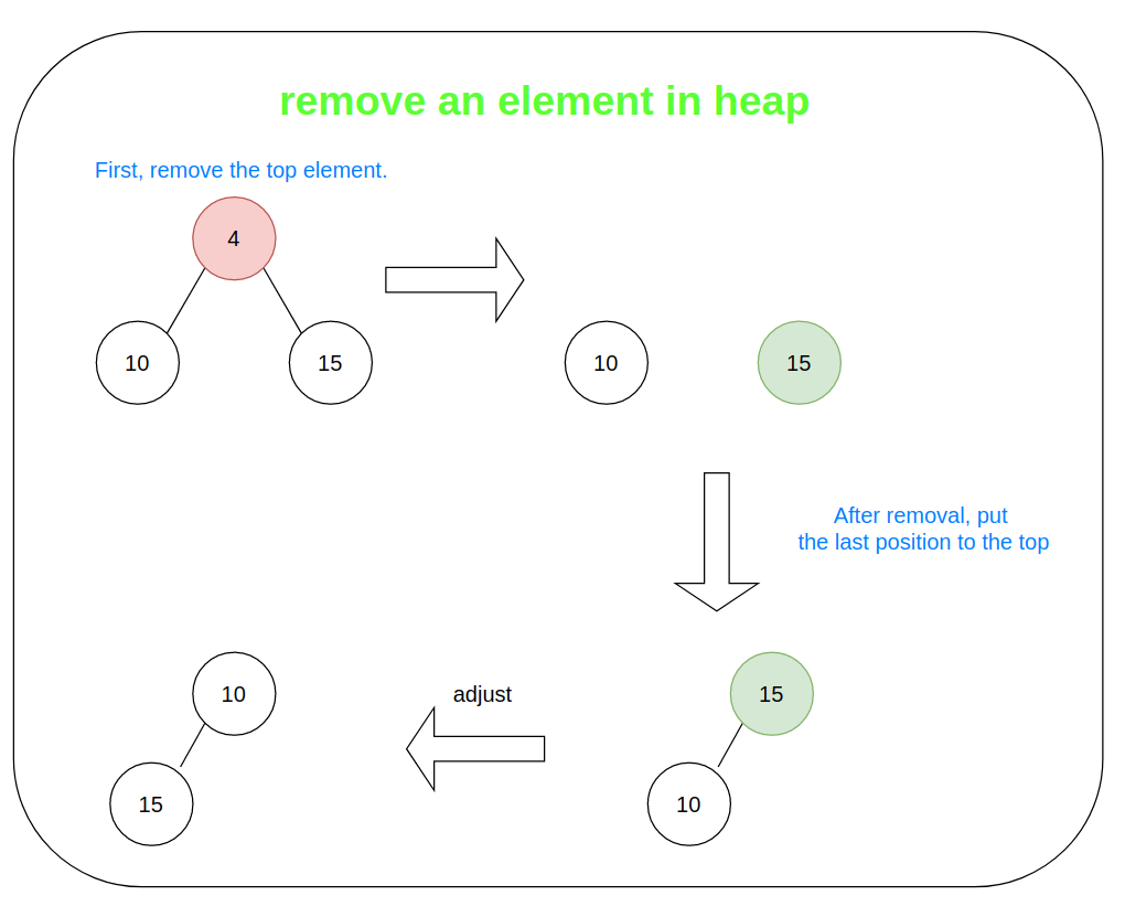 Remove an element: remove the highest element and put the element at last position to the top, then bubble it down.