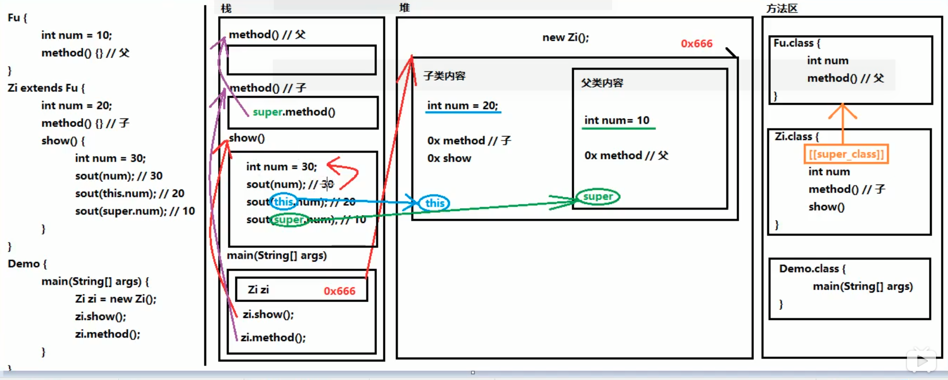 注意事项:无论是成员方法还是成员变量,如果没有都是向上找父类,不会向下找子类。