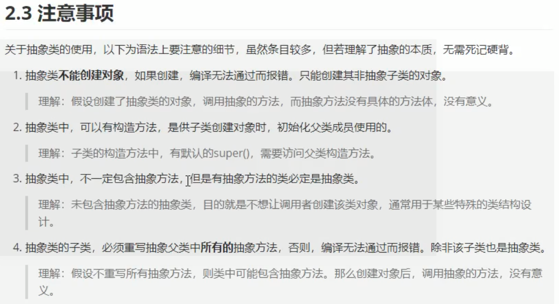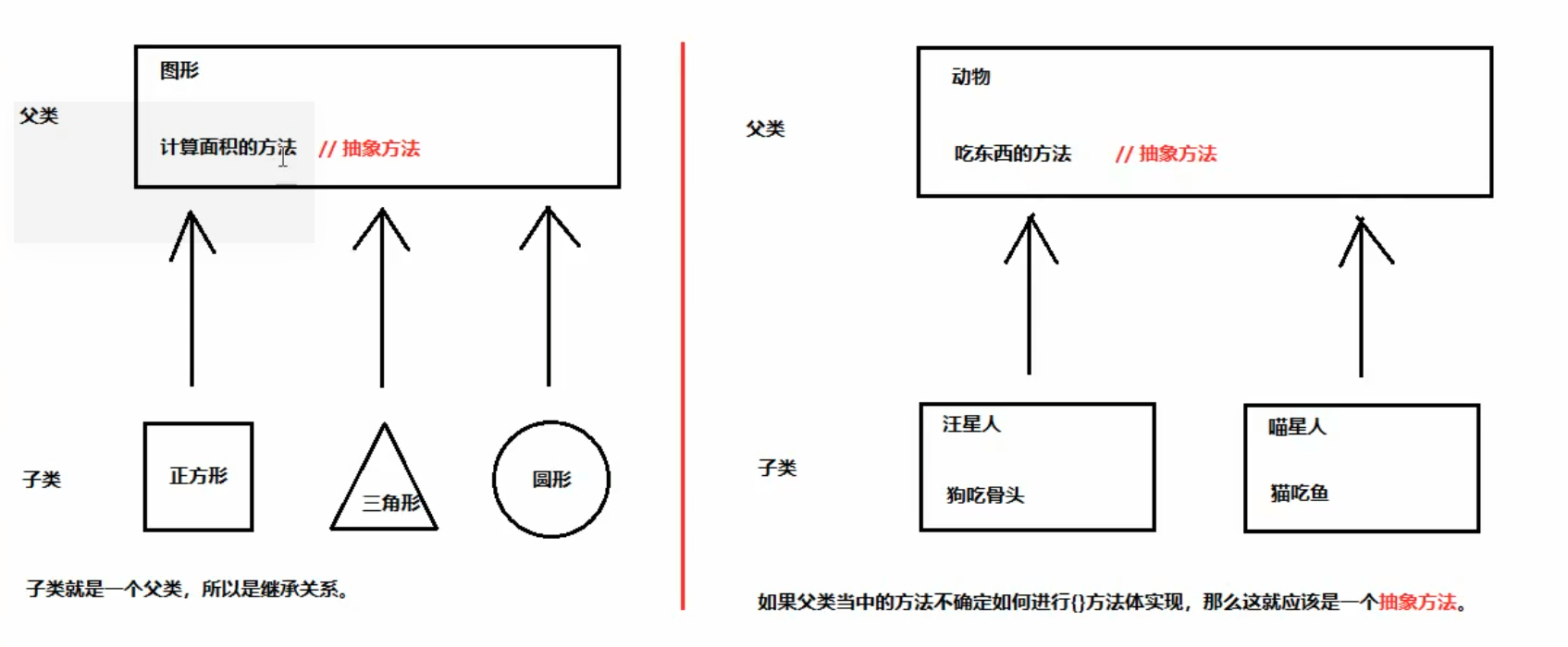 - 子类必须覆盖重写抽象父类当中所有的抽象方法。 覆盖重写(实现):子类去掉抽象方法的abstract关键字,补上大括号和方法体。