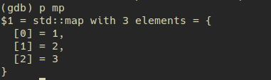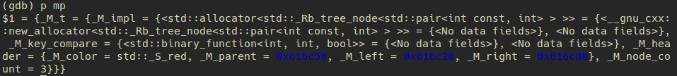 例如在打印一个map<int, int> mp;中的变量mp时,在gdb中使用print mp返回的是如下的结果