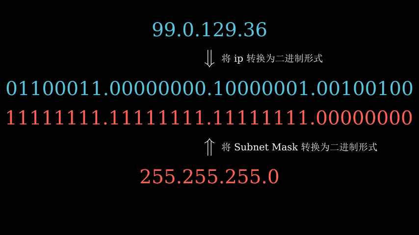 首先我们将 ip 转换为其二进制的形式,对于 subnet mask 也是如此。