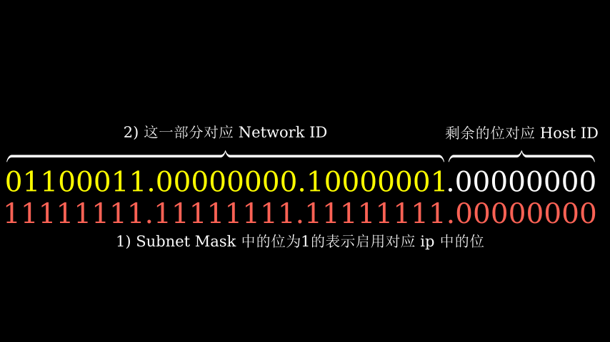 得到相对应的二进制编码形式后,有这样一个规则:subnet mask 二进制形式中为 1 的位,则“启用”对应的 ip 的位置,来看下面这张图: