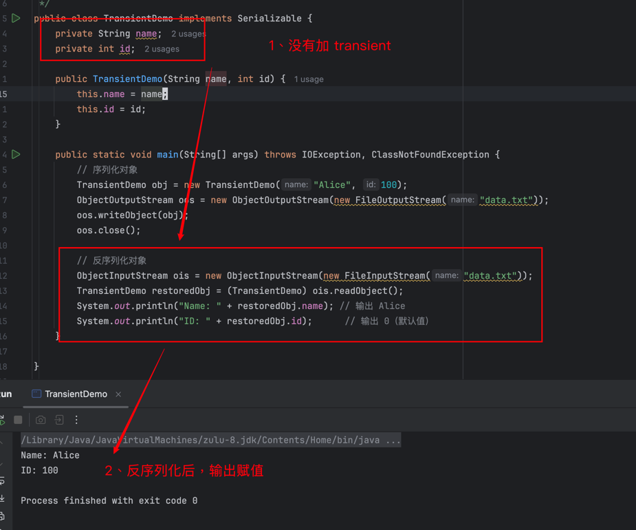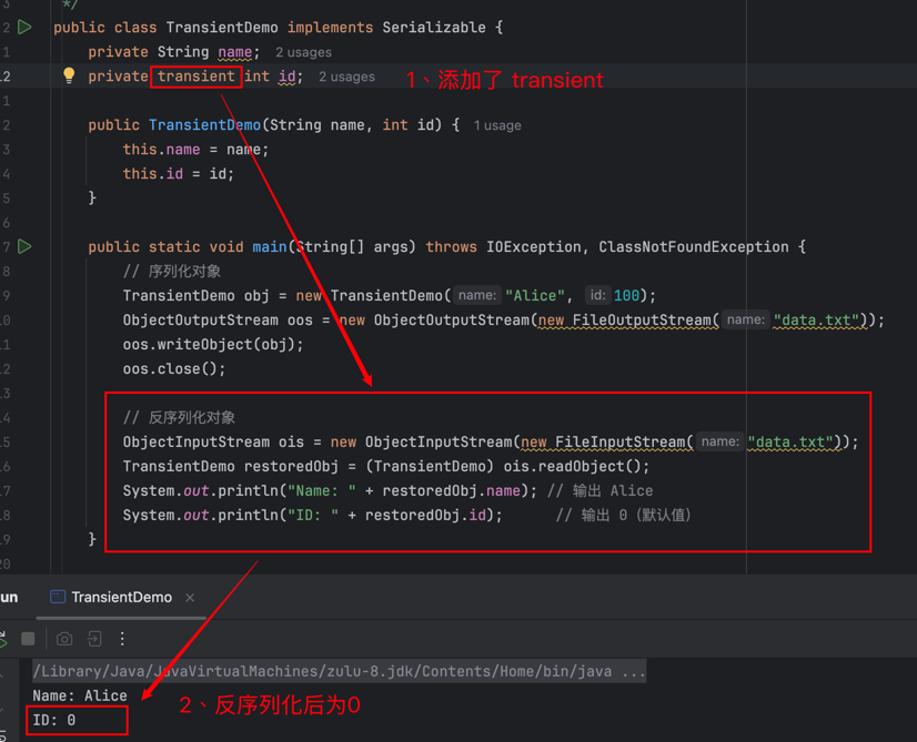 序列化过程中,用 transient 标记的字段会被排除在序列化过程之外,反序列化时该字段的值会被设为默认值(对象为 null, int 类型字段为 0)。
