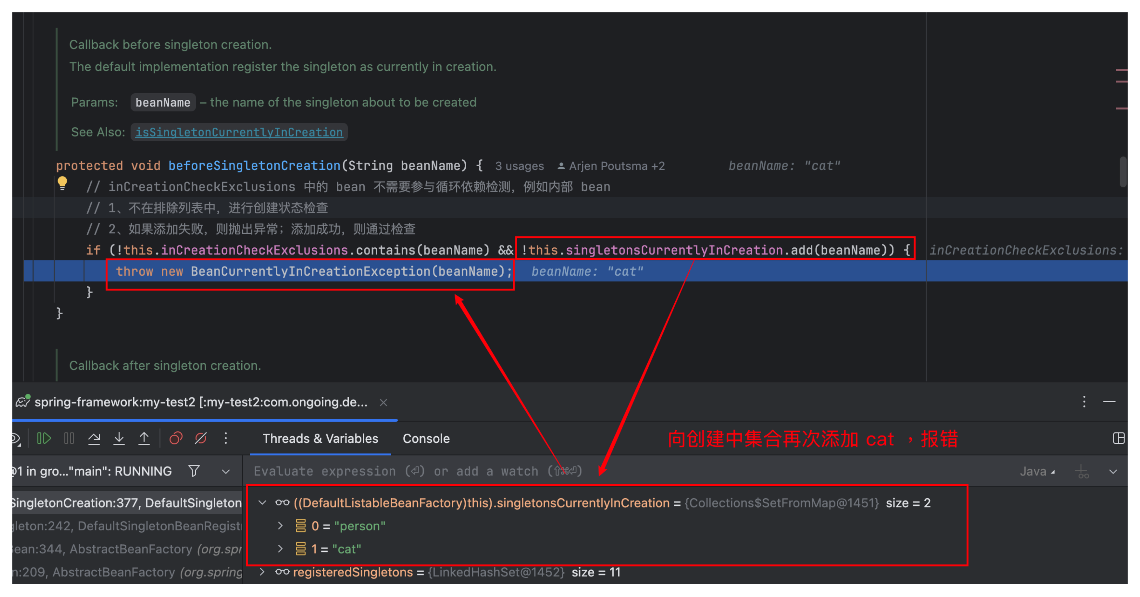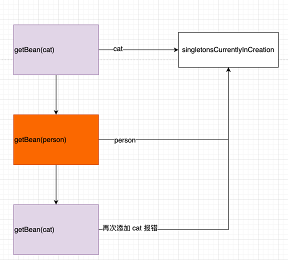 singletonsCurrentlyInCreation发现 cat 正在创建中,被拦截下来报错。