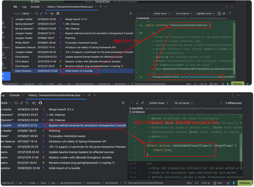 直接在spring源码中搜索default关键字的接口,你会发现很多这样使用的例子。最开始就是普通接口及接口方法的声明,后面有default关键字声明的方法。