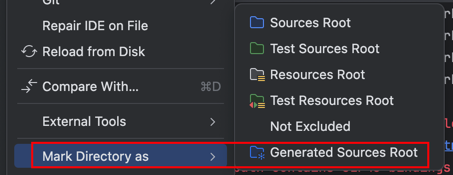 - 右键该目录选择 “Mark Directory as” → “Generated Sources Root”