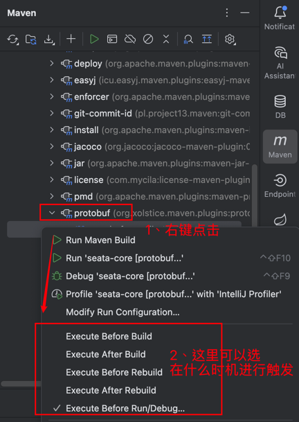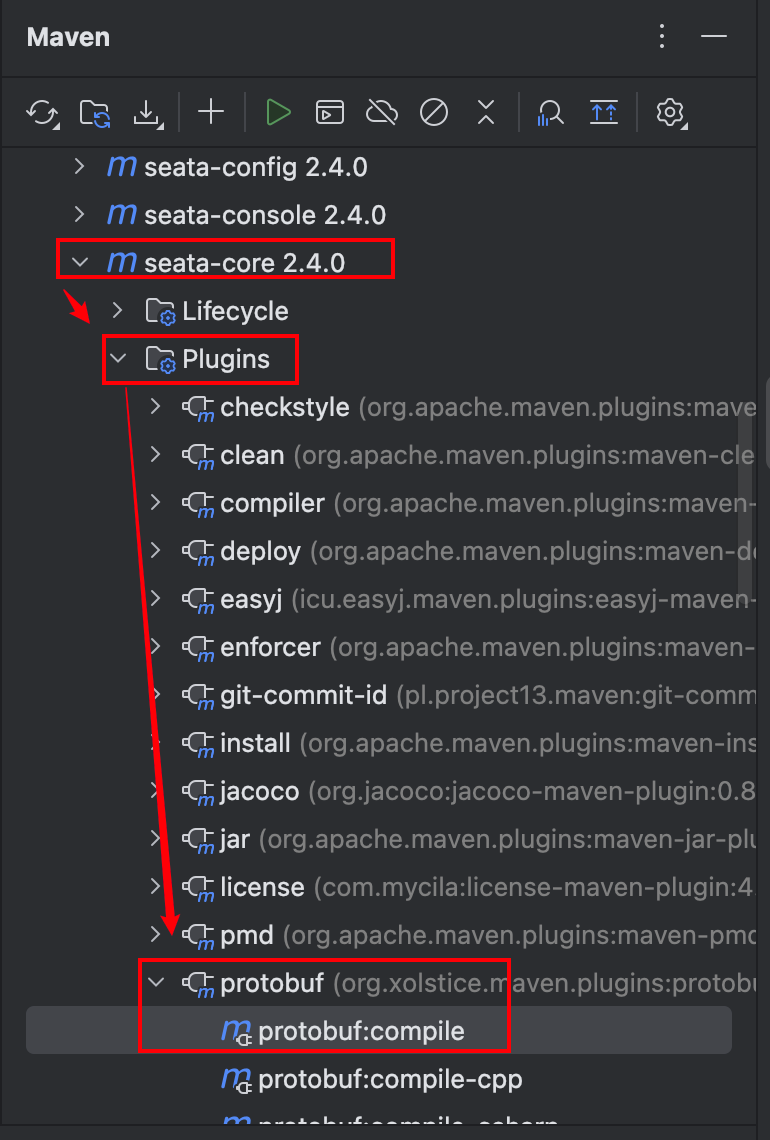 在 maven 下的 seata-core 模块的 protobuf,点击插件,进行 compile,手动生成类。